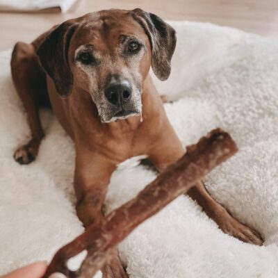 Zwanghaftes Anknabbern von Gegenständen und eine regelrechte Zerstörungswut deuten oftmals daraufhin, dass ein Hund gestresst ist. Hundekauartikel können helfen, das Stressempfinden von Hunden zu reduzieren. Denn Kauen entspannt die Kiefermuskulatur und fördert die Freisetzung von Glückhormonen (Endorphine). Dieser Effekt wird verstärkt, wenn Hunde auf Kauartikeln herumbeißen können, die verführerisch riechen und lecker schmecken. Gesunde Hunde sind nicht nur körperlich fit, auch das emotionale und soziale Wohlbefinden ist essenziell für die Hundegesundheit. Mit natürlichen Kauartikeln können wir das Wohlbefinden unserer Hunde nachhaltig fördern.