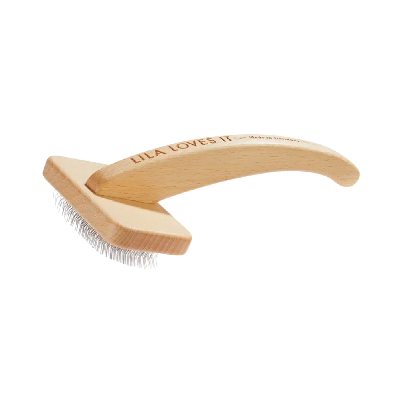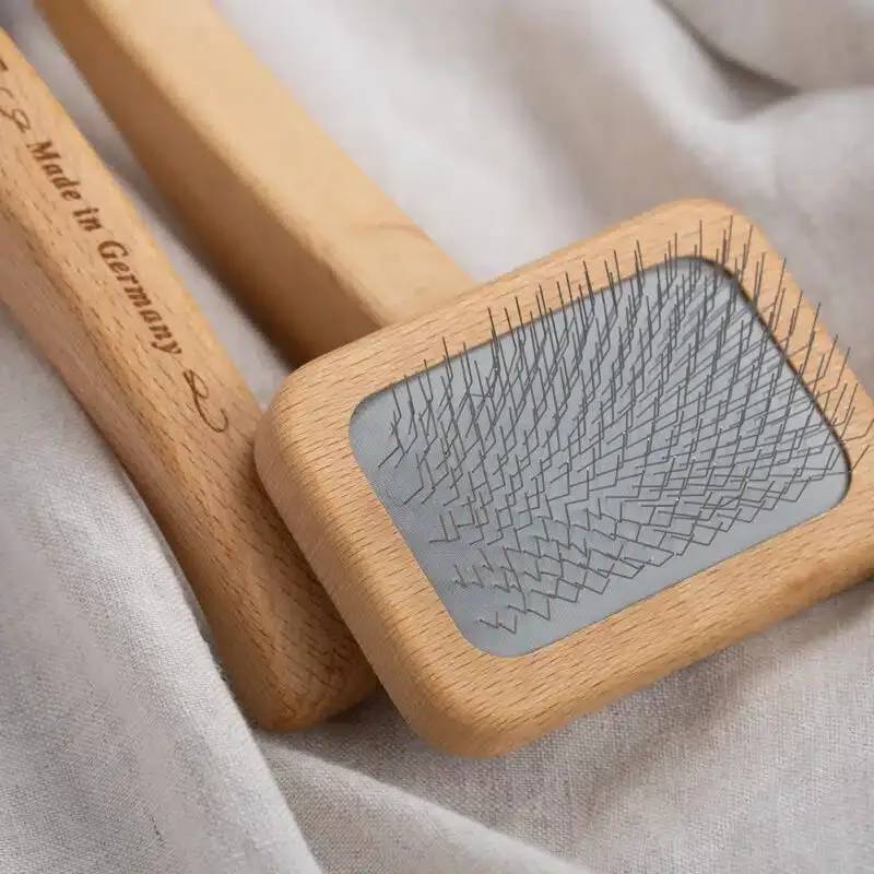 Our SLICKER BRUSH made of oiled beech wood turns elaborate coat care into a relaxing feel-good ritual. The innovative handle is designed to lie comfortably in the hand. The fine metal tines glide effortlessly through long hair and untangle dense undercoat. The brush plucks knots, dirt, and tangles thoroughly, but without pulling.