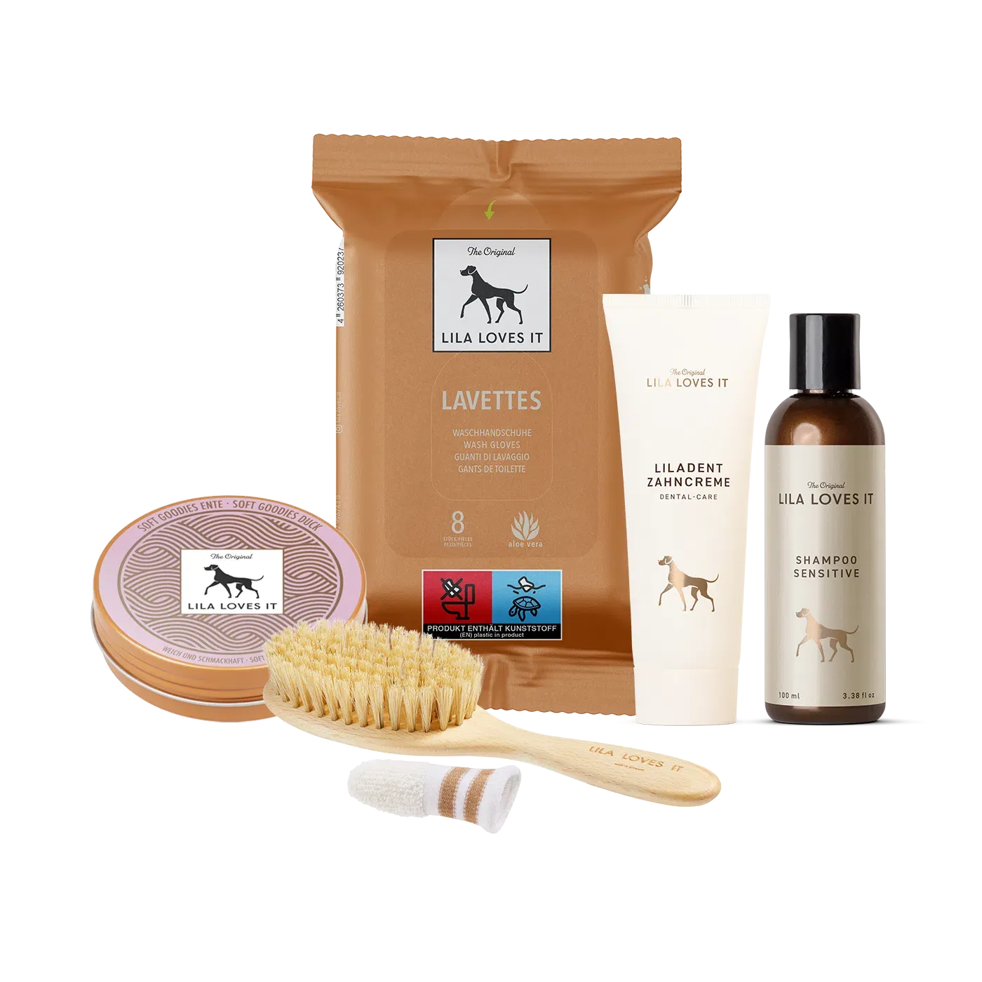 The SHAMPOO SENSITIVE is a care product specially developed for sensitive dog skin. Free from silicones, parabens, paraffins and perfumes, it thoroughly cleanses and gently cares for your puppy’s delicate skin. With its soft natural bristles, the PUPPY BRUSH helps to clean the sensitive puppy coat. The act of brushing promotes the dog-human bond, creates trust, and is a lovely daily ritual where both can relax. This allows you to get your puppy used to grooming slowly and playfully right from the start. Our LAVETTES WASH GLOVES are a particularly practical aid for quick cleaning on the go. They clean gently and quickly and are therefore ideal for any occasion.